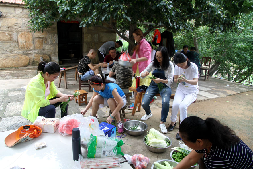 這處清幽潔凈的農(nóng)家小院成了隊員大展廚藝的用武之地,大家迅速整理好自帶的蔬菜食物,按各自特長分好工。有清理蔬菜的、有和面的、有刷鍋燒水的,那些實在幫不上忙的便湊到一起圍坐在院中的樹蔭下開始“摜蛋”比賽。廚房中,面對農(nóng)戶家中的那兩口大草鍋,負(fù)責(zé)炒菜的隊員直撓頭,因為在城里實在是無處尋覓這樣的鍋灶了,更不知該如何才能把這灶火燒得旺旺的。這時我們的女隊員劉惠自告奮勇,勇敢地?fù)?dān)起了“伙頭軍”的重任。還別說,在經(jīng)過戶主老大爺?shù)囊环更c后,一會兒功夫這灶火便被她燒得有規(guī)有距起來。很快,灶房便飄出了炒肉、煎蛋的香味。此時,院中也已擺起了包旱餃的陣式來了。面已和好,兩種口味的餡料也已備好。有負(fù)責(zé)搟餃子皮的,有負(fù)責(zé)包餃子的,隊員們賽速度、賽質(zhì)量,兩種口味的餃子被分別擺放在各自的簸箕里。看著形態(tài)各異的餃子,大家忍不住評價起來,最終有隊員被冠上了“專業(yè)面點師”的雅號。人多力量大,當(dāng)所有的菜肴、面點擺到長桌上時,大家開心不已,雖然這算不上美味佳肴,但自己的勞動果實卻總是最美味。