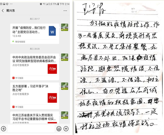 為了引導黨員統一思想認識,凝聚思想共識,激發黨員做好疫情防控工作的思想自覺和行動自覺。2月12日,臺南供電所通過微信方式組織開展了“疫情防控,我們在行動”主題黨日活動。在微信平臺上,黨員們共同學習了《中共中央政治局常務委員會召開會議研究新型冠狀病毒感染的肺炎疫情防控工作 》、《五方面部署,習近平落子“決勝之地”》、《江蘇省委常委會召開會議進一步把疫情防控工作做實做細做到位》重要指示精神;同時,開展了“我為疫情防控出份力”活動,全體黨員暢談疫情防控體會和做法。黨員王守富在活動中表示,作為一名基層黨員,前提是形成思想共識,不參與集體聚餐,在家盡量不外出,不信謠、不傳謠,樹立信心奮力營造眾志成城抗擊疫情的積極氛圍,在黨中央統一領導下,一定能打好疫情防控保衛戰。(劉繼美)