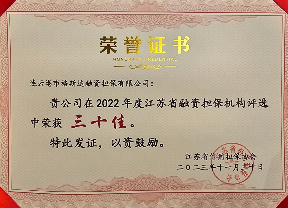 ??3月23日,江蘇省信用擔保協會在南京召開會議。連云港市格斯達融資擔保有限公司被授予“江蘇省2022年度融資擔保機構三十佳”榮譽。本次全省共有71家融資擔保機構參加評選,格斯達擔保公司成功入選。