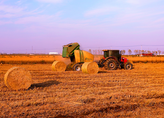 (摟草機和秸稈打包機正在地里作業)