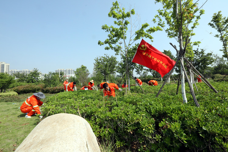 活動分為四組進行,四組黨員突擊隊跟隨引導員的腳步到達各自片區,進行綠化帶雜草清除作業。在各組支部書記的帶領下,勞動中人人做表率,個個干勁足,有條不紊互相配合,一抹抹橘色在清新草色的襯托下格外美麗。