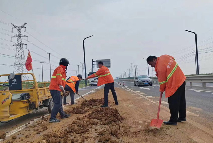 727日上午,臨近下班之時,該分公司228省道班長姚功,接到公司應急處理電話,疏港大道向西路面近1500多米長,車輛拋灑嚴重影響往來車輛安全經過。正在下班的途中他二話沒說,調轉車頭奔赴事發地點疏港大道,迅速擺開安全錐,揮動手中鐵銑開始突擊清理路面上礦土,石塊。聞訊得知此事,共產黨員紀樹好,胡可貴,班組成員孫洪召等同志二話沒說,一并趕往現場支援,橙色工作服在陽光照耀下顯得格外靚麗。工作現場,遇到大的石塊他們就用手搬,小的、碎的就用鐵锨和掃把清理,中午的陽光火辣辣的,他們就這樣頂著烈日奮戰近兩個多小時,共轉運礦土泥塊、石子近10余車,高質高效保障了核心道路車輛安全通行。(楊波)