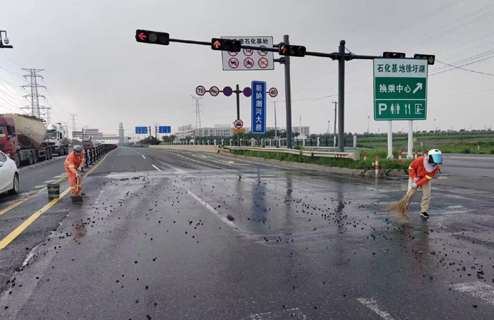 為及時快速排除道路突發障礙,保障路面車輛行人安全暢通,保潔勇士無懼高溫炎熱天氣,快速高效清理路面車輛拋灑,工作中用汗水彰顯責任與擔當。